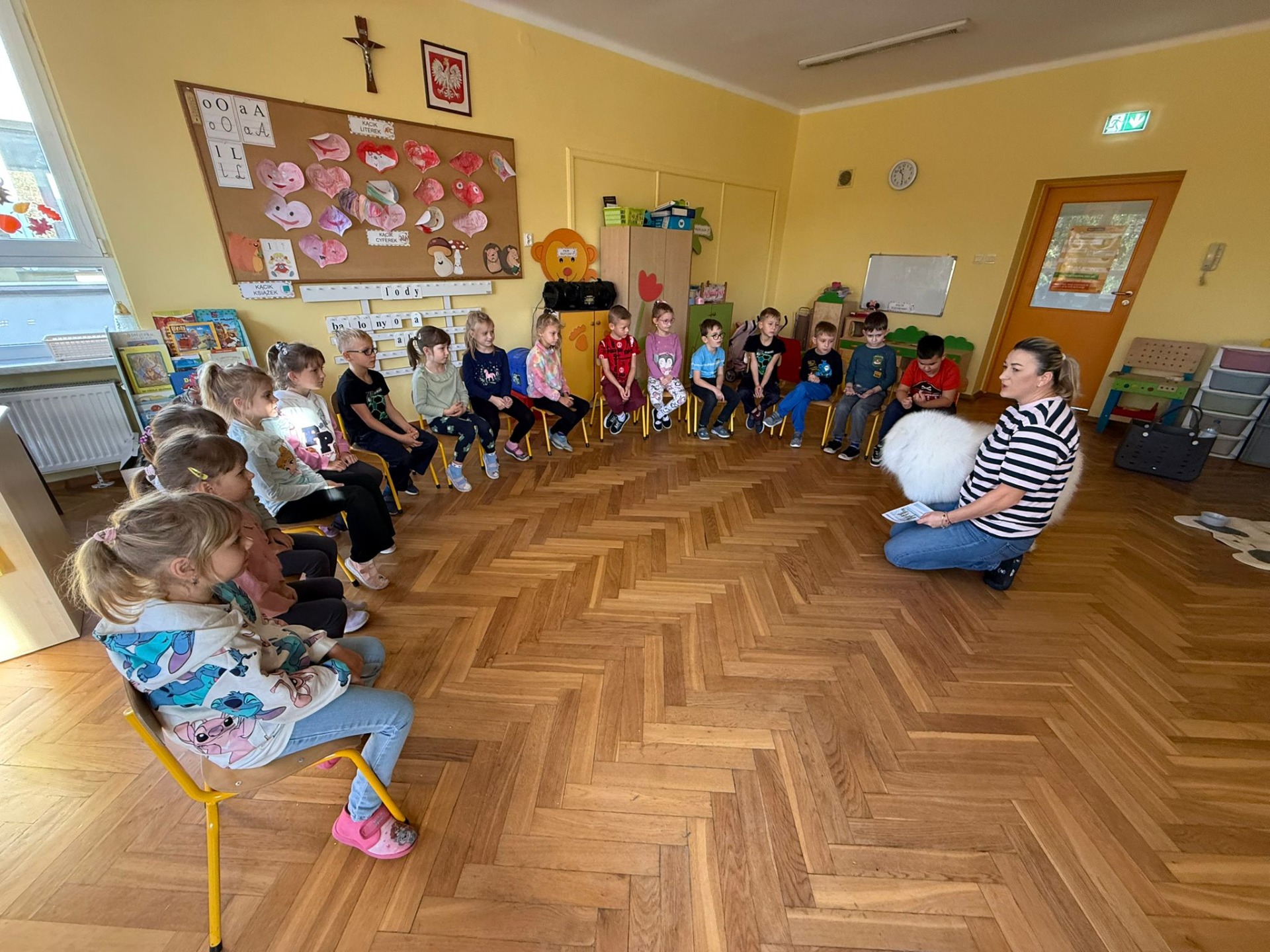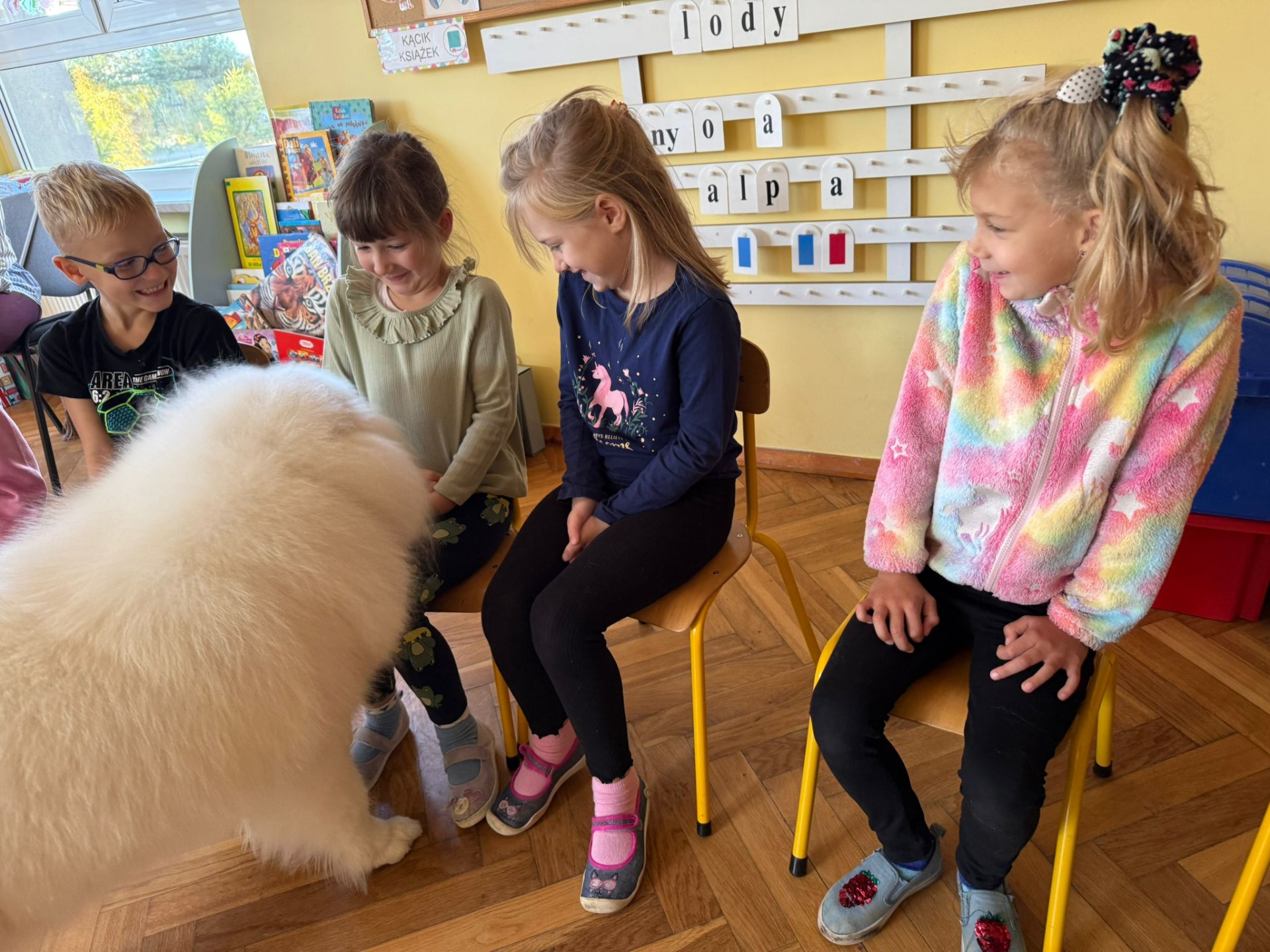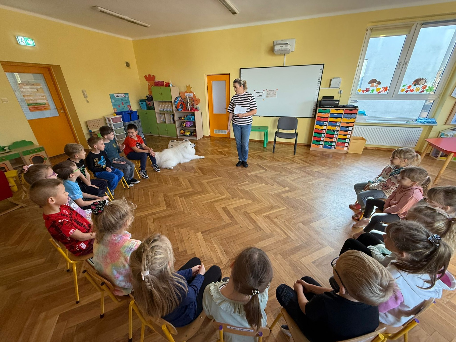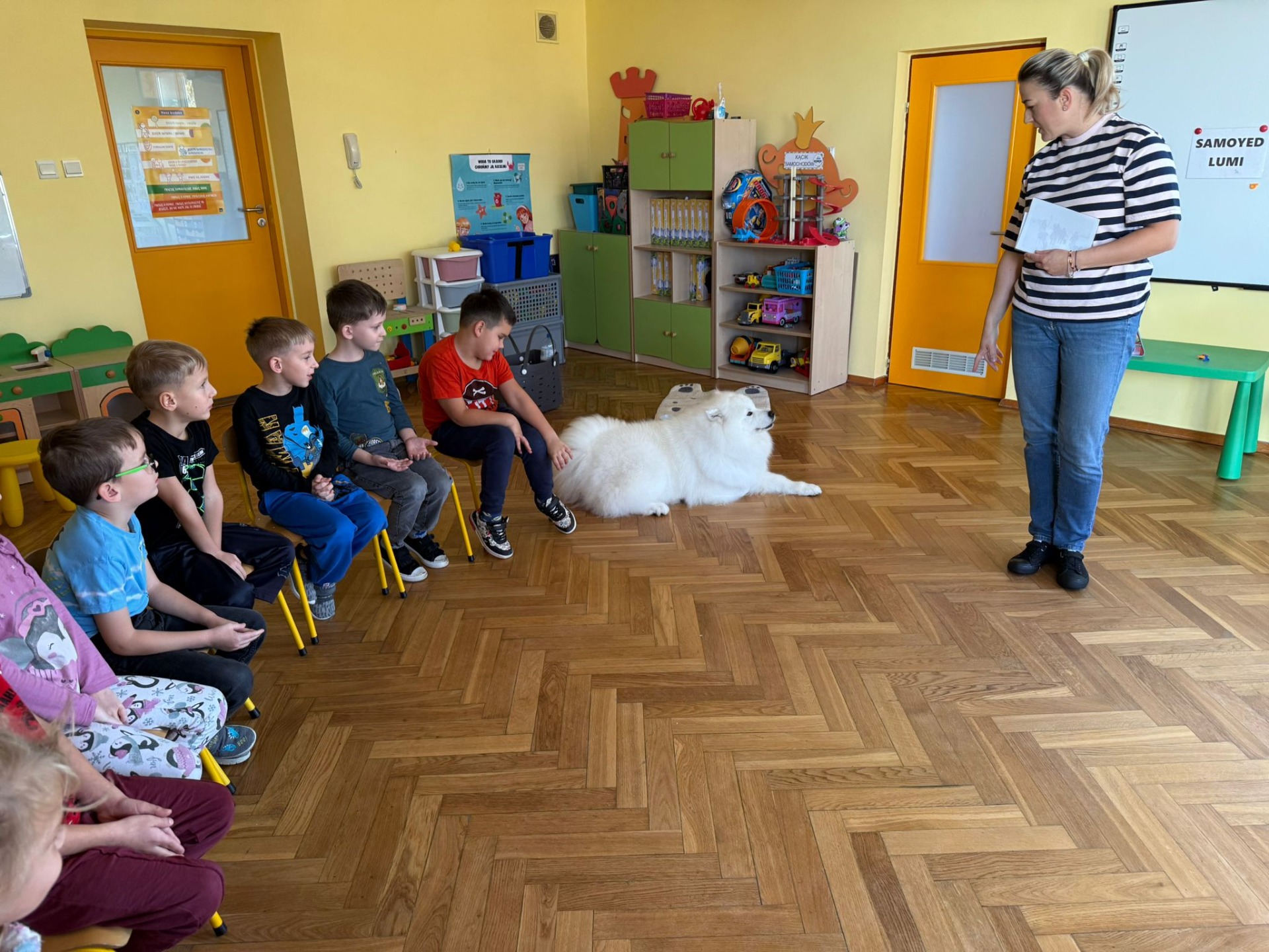 W dniu 29.10.2025r. w grupie „Lisków” i „Zajączków” odbyły się zajęcia z dogoterapii prowadzone przez panią Martę Iwańską oraz jej psa Lumi.